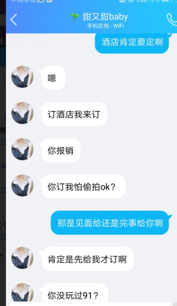 玩91 这么久了 很少遇到这样的情况 人没见到 让先转账。和夫妻也交往过几对,开房 吃饭 活动 礼物 费用都没有问题。但是前提是先见到。交友交友,是长期能交的朋友,而不是发泄。而且我们都是不喜欢见面就啪啪的 还不如去找小姐 。300.500就解决问题了。不知道有人跟楼主聊天过没有。话不多说,上图