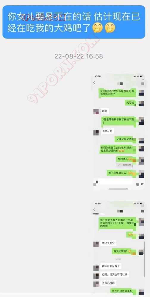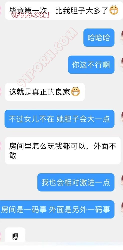 跟她们母女拉开距离后,在手机上撩她,下面自己反馈湿漉漉的了。我也时不时的打趣她。过了一会后转场第二个刺激的点。去了海豚表演的地方,这个时候主要就是刺激他老公了,让她把裙子撩起来到大腿,我在边上看实际上是拍小视频给她老公看,她也照做,只是没有达到我想要的标准,因为光线比较亮,她是第一次,我也没勉强只是她老公就激动坏了,然后第三个激情点,我让她去上厕所,让她小孩在剧场看海豚,我尾随,在她出厕所的时候我一把抱住来了个舌吻,她紧张坏了,呼吸很重,很急促,我还悄咪咪的袭胸了,不过时间不长,边上有人,且她小孩还在剧场大概过程不到一分钟吧舌吻。