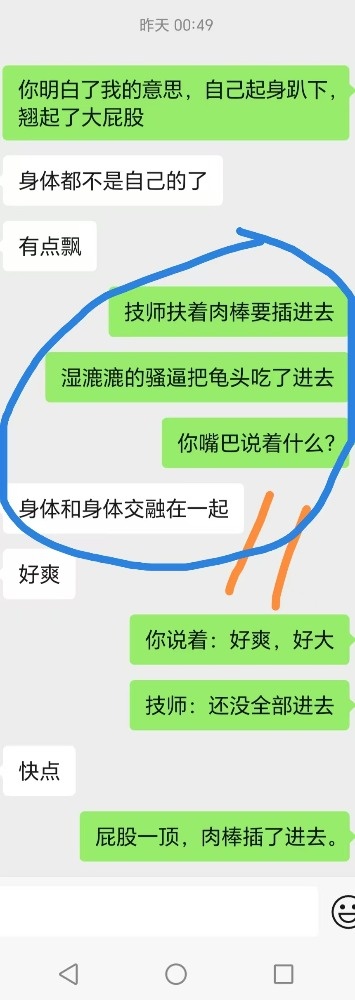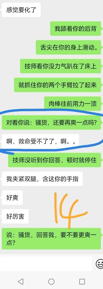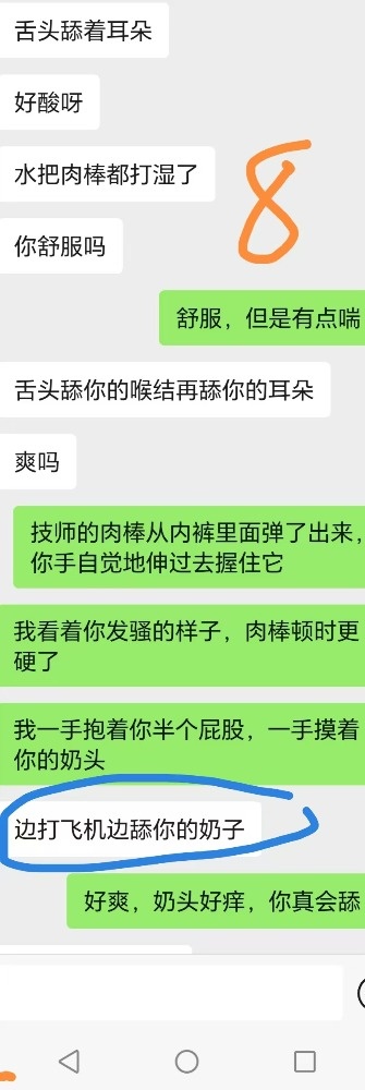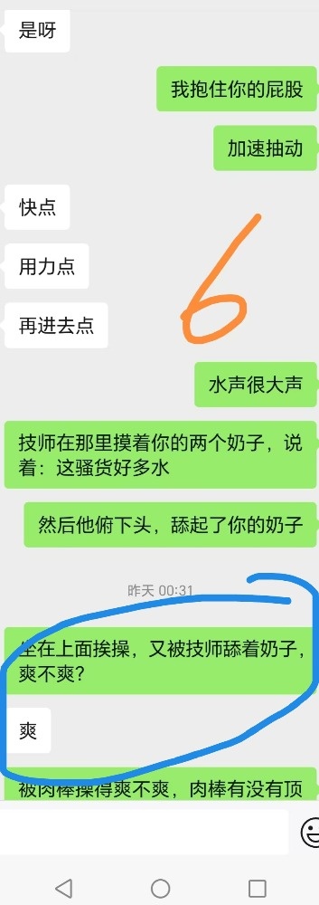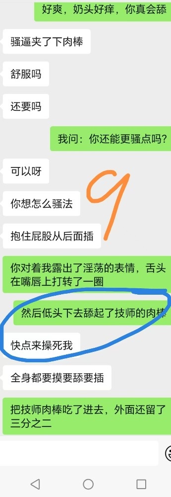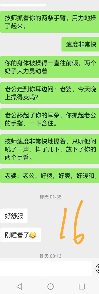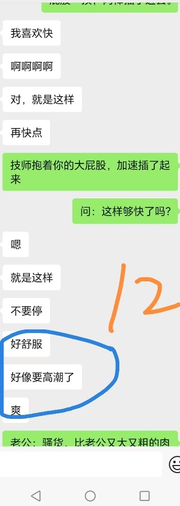 给技师舔肉棒后,还喊着技师快点来操死她。跟老公说技师的肉棒又粗又大的时候一直喊好舒服。夸赞我和技师两个人太厉害,把她搞得太舒服了不想动,感觉很飘,身体都不是自己的了,第一次有这样的感觉。两个人搞她,爽死她了,靠想象就被搞高潮了。
